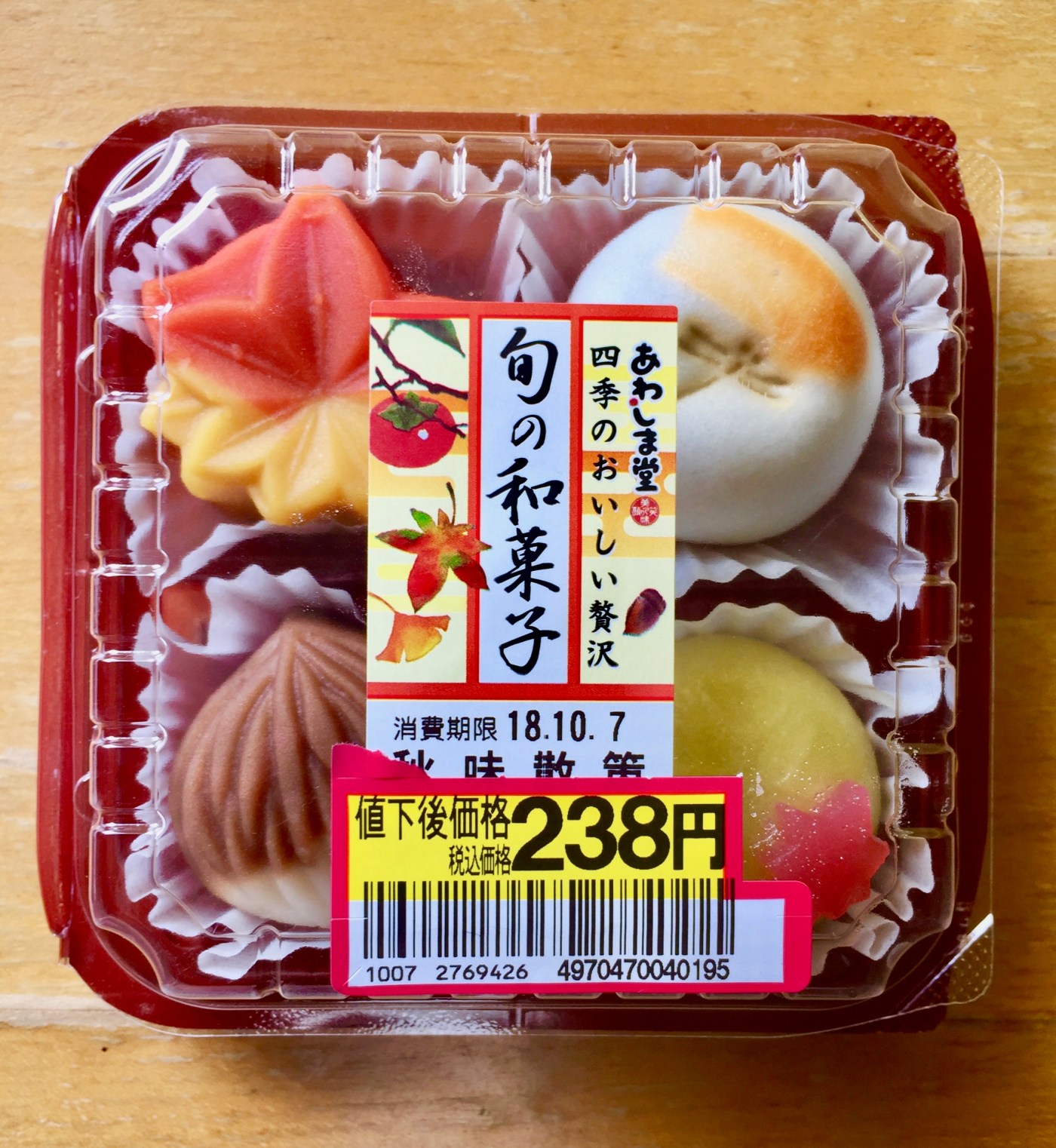 These were especially delicious. Orange and red and yellow and brown, each of the four sweets was a variation on the theme of bean paste and mochi. The autumn leaf and the chestnut were both made of white bean paste that had been colored and shaped. The dragonfly had a flakey exterior filled with red bean paste, and the yellow blob was made of mochi filled with two different consistencies of bean. Each was sweet and gooey and completely indulgent and I enjoyed them, even more, knowing that I’d gotten them on sale.