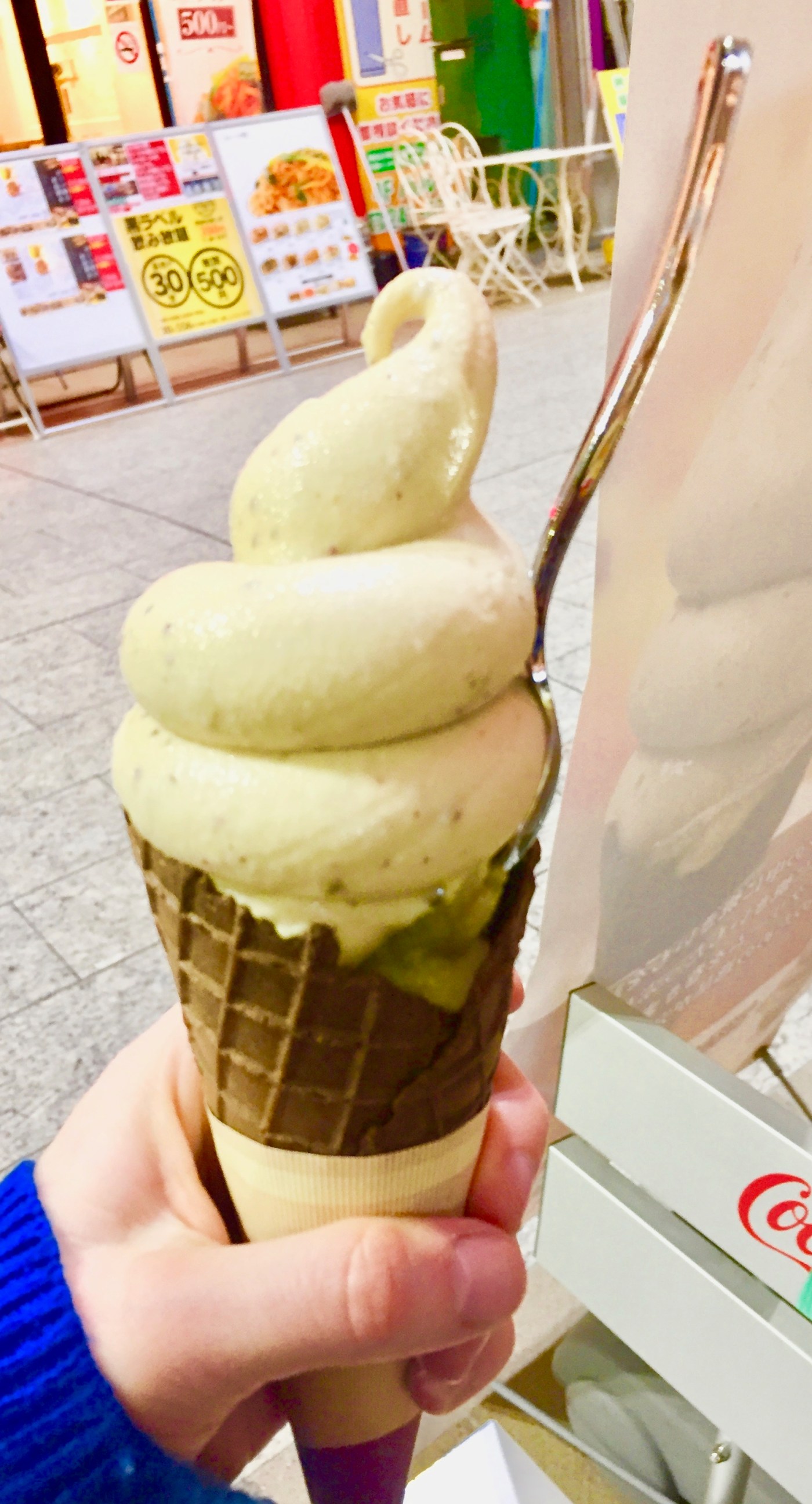 I love the sweet potato. It’s a millennial thing – like the quiet, shy, stepsister of the avocado. Roast it, bake it, steam it, stir-fry it, blend it into a soup there is nothing that cannot be improved by a little sweet potato. And now, I can happily attest, that this includes ice cream. This swirl of sweet potato ice cream, which tops a cone stuffed with mashed, buttery sweet potato, is one of the better desserts I have ever had. After a long day, wandering the tourist streets of Osu Kannon on a wet, Tuesday afternoon, the rich sweetness of this ice cream is both indulgent and surprisingly nourishing. Like eating a meal backward, you start from the top with the creamy, potato-flecked ice-cream and finish with a very filling portion of mashed potato. It is somehow both a new taste experience and a reassuring comfort food – a reminder of how you cannot always neatly categorize the world into either “new” or “familiar.” And a reminder that there are very few flavors that make poor ice-creams.
